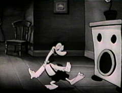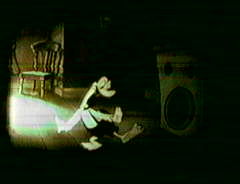 The end result can be seen in the first still on the left. Notice how Gandy Goose appears trapped in a shrunken picture area with a thick black frame around him. Note too that details in the shot aren't too visible, that there's a greenish-yellow tint to the scene, and it looks like Gandy is almost dancing in the dark.