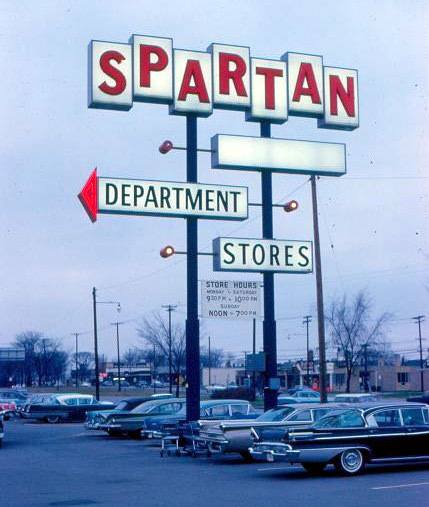 I loved this store. It was a '60s classic through and through. It embodied all the elements that came to symbolize the 1960s discount store as I like to remember it, and memories of it today evoke nostalgia at its best. It had a wonderful, huge sign in the parking lot with the red "Spartan" letters on staggered white blocks and a red neon arrow pointing toward the store. One of its Kansas City locations was in Mission, Kansas, only a short distance away from the house we moved into in January, 1965, and I begged my mother to take me there after I got my first look at it from a distance as we passed by it on our way somewhere else. We finally paid our first visit to it that summer, and many visits soon followed.