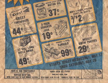 Due to the fact that the '70s marked the end for most of the discount stores mentioned here, and I didn't even have a camera back then, my visual resources for this site are very limited. Although Sam's Bargain Town had their heyday in the '50s, '60s and probably the '70s, all photos shown here were taken in the '80s; it wasn't too long after that that Sam's called it quits (the Raytown store was eventually demolished with a new supermarket replacing it on the lot). Needless to say, I'd love to get my hands on some old vintage photos of these types of stores from 30 to 40 years ago, including the building exteriors and interiors, and the parking lot signs, both in daylight and lit up at night, especially in color. There have been books published illustrating design changes over the years in supermarkets, drive-in restaurants and gas stations, and it is my fervent hope and belief that at least a few individuals out there were resourceful enough to gather stacks of color or black-and-white shots of many of these long-gone discount stores while they had the chance, retaining them in case someone wanted to create a lavishly-illustrated book on the subject.