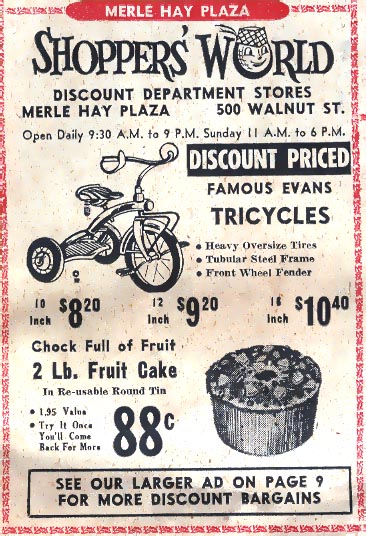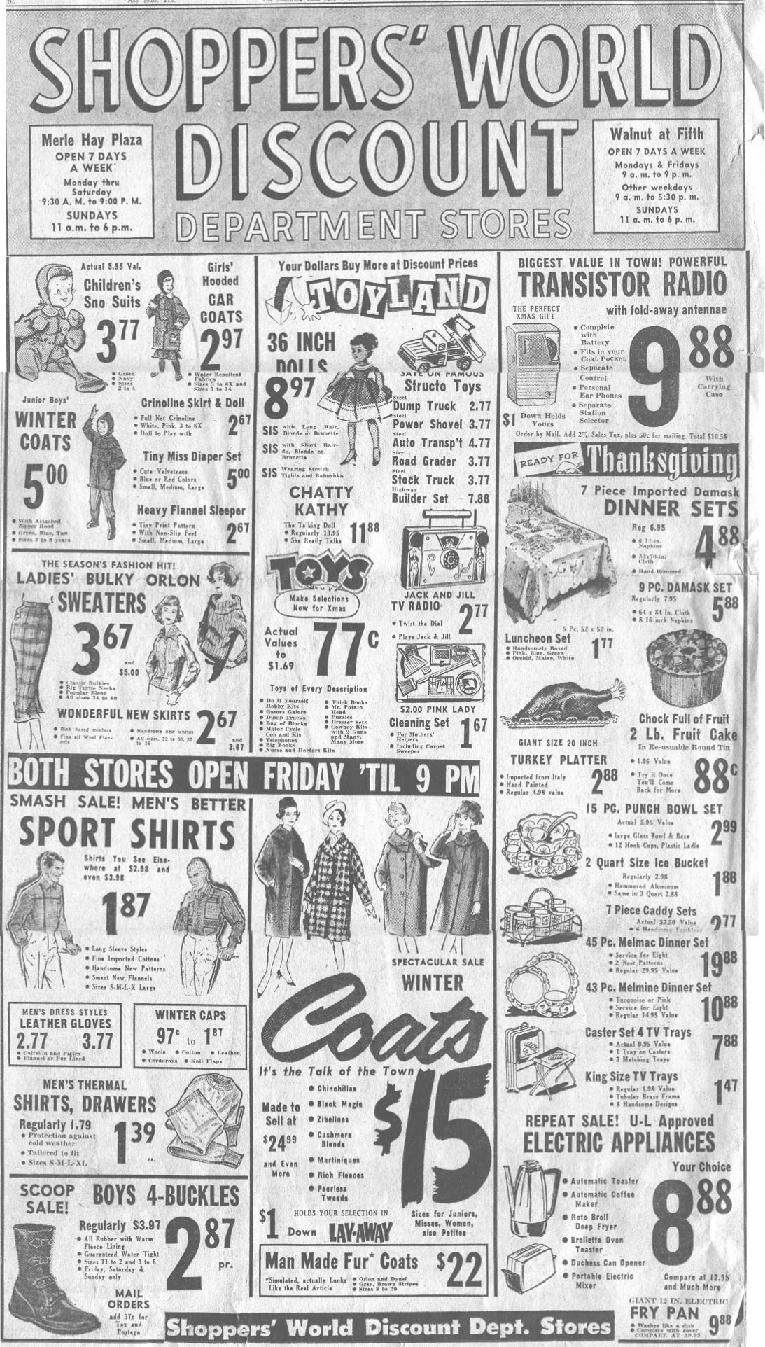 Here are two 1960 ads for the Des Moines Shoppers World stores which came out about a week before Thanksgiving; check out those prices!