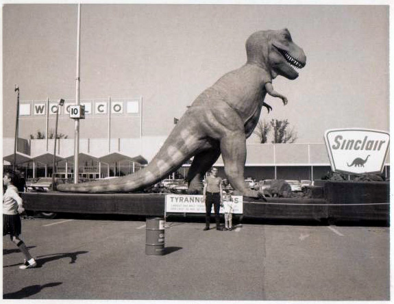 The very first Woolco ever built opened in Columbus, Ohio in 1962; what a great sign and entryway. Directly below is an identical Woolco in Louisville, Kentucky whose parking lot served as a promotional arena for Sinclair gas stations, as noted by the presence of their huge Dino mascot. Below that is a full-color close-up of a similar Woolco entryway.