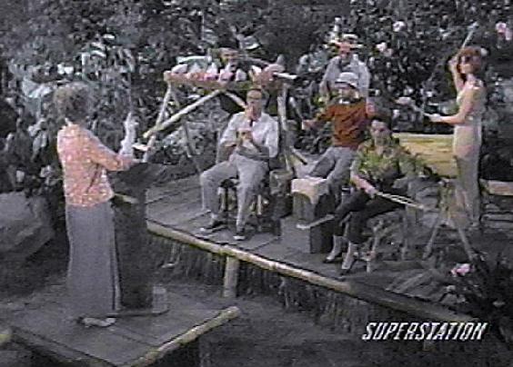 Gilligan's impressive jungle drum playing inspires Mrs. Howell to form a symphony orchestra with each castaway playing a different instrument. Lovey is the conductor, Mr. Howell plays the triangle, the Skipper uses conch shells as a wind instrument, the Professor plays the flute and Mary Ann is on the musical saw. Unfortunately, Gilligan's drumming sends an inadvertant message to a tribe of savages who think they're under enemy attack and pay the castaways a little visit.
