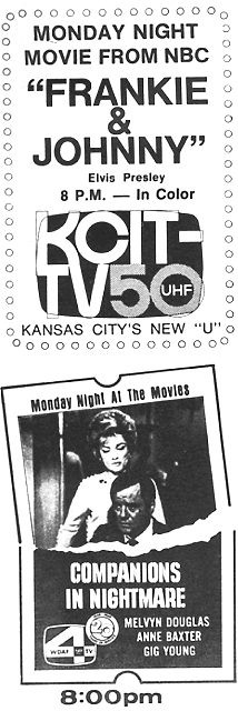 K.C. area TV dealers and electronics stores helped spread the word about the coming of Channel 50 to boost sales. At right: a KCIT ad for the ABC network airing of "Georgy Girl", which became the first affiliate pre-empted network movie they aired. (Commentary on the other ad seen above MAY come later on the off chance I can ever figure out how to get a block of text into the empty space in the upper-left corner of the framed illustration.)