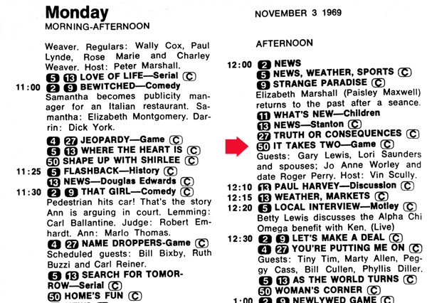 Until then, however, network daytime schedules in the Fall of 1969 were merely undergoing the first stage of transition toward a new look for a new decade, and Kansas City's primary affiliates appeared to be only tepidly enthused, judging by how much of it they were willing to clear. As KCMO continued to offer syndicated fare in the 9-10 AM slot, KCIT quickly took advantage of their option to pick up CBS's daytime reruns of The Lucy Show and The Beverly Hillbillies which filled the hour nationally. But in those early days of KCIT's operations, they didn't sign on till 9:30 AM and had to run those two back-to-back CBS morning offerings in the afternoon via tape-delay (despite the fact that CBS ran the daytime Hillbillies at 9:30--don't ask me why KCIT felt the need for a tape-delay). At 3 PM they picked up the live NBC feed of the game show that replaced the long-running, original Match Game, Letters To Laugh-In hosted by Gary Owens. But this was purely a fad game inspired by NBC's Rowan & Martin's Laugh-In, a prime-time smash of the day (with Owens as its on-screen announcer), which had no chance of a long run, and at the end of the year was axed by NBC and replaced with Name Droppers, a game NBC introduced in September which had been cleared by WDAF in its original 11:30 AM slot. With its move to 3 PM, it switched channels in K.C. from 4 to 50 until NBC dropped it entirely a few months into 1970. Another NBC game show turned down by WDAF was noticably missing from KCIT's weekday lineup, much to my disappointment. In the Spring of 1969, the Peacock network pulled the plug on its faltering Goodson-Todman game Snap Judgment--which started out in 1967 as a fairly original word game and reportedly ended up being a clone of their popular Password (axed by CBS in September 1967)--and replaced it with a new game from You Don't Say! creator Ralph Andrews, It Takes Two. I was totally unaware of this change in the 9 AM slot on NBC until I chanced to see it for the first time on Memorial Day that year while we were visiting relatives in Des Moines, where it regularly aired on WHO-TV. At first I was unhappy with NBC for doing away with Snap Judgment which I hadn't seen regularly since the start of 1968, but It Takes Two soon grabbed my attention with it's futuristic-looking set designed by E. Jay Krause, Bob Inkleas and John Schrum, it's great theme music and underscoring by Stan Worth--particularly a ten-second "think" piece played as three celebrity couples wrote down their answers to questions which were accompanied by objects or people having to do with the subject of the questions--and a most unusual choice for the host who asked those questions: famed "voice of the Los Angeles Dodgers" Vin Scully. I didn't catch his name until it was used as a Bonus Board answer on one of the last You Don't Say! broadcasts (whereupon I thought his first name was "Vic") and I had no idea that he had a long involvement with baseball broadcasts until TV Guide� ran an article on him in 1970. The reason I was unaware of the show's existence until eight weeks after its debut was because WDAF opted to pre-empt both it and the post-1967 Snap Judgment shows in favor of their own local studio offering, The Bette Hayes Show (pronounced "Betty"), which was popular with Kansas City homemakers since the early days when they ran it in the afternoon under its original name, Accent. The local edition of TV Guide had only one other NBC affiliate listed: KTSB in Topeka (which is now KSNT and didn't go on the air till the end of 1967 as it was on UHF and the station wanted to be sure there were enough homes with 82-channel sets--mainly color--to bring it in), and they didn't start airing It Takes Two until it was a year old on NBC. But the show was tentatively scheduled to air in Kansas City on KCIT at 12 noon. At least that's what the November 1, 1969 issue of TV Guide told us. I was doubly-thrilled, because even though I'd usually end up missing the show entirely in those pre-VCR days due to being in junior high school (yecch!), Thursday and Friday of that week were in-service days for the teachers, so I'd have those days off to stay home and finally be able to see my beloved NBC daytime cast-off from WDAF! But it never came to pass. Instead, I was treated to an hour of High-Noon Cartoons which led into KCIT's 1 PM airing of yet another NBC daytime show WDAF avoided for years, the successful and still-running soap opera Days Of Our Lives which WDAF would eventually start airing around 1971 (and which the afore-mentioned Des Moines affiliate WHO wouldn't begin clearing until 1984--making them the last NBC station in America to put it on). To add insult to injury, the theme music KCIT used for High-Noon Cartoons sounded--I swear--like it was mocking me. On the off chance you ever heard it, you'd know what I mean.  From the November 1, 1969 Kansas City Edition of TV Guide: a KCIT program listing that, sadly, never came true. (Courtesy of Earl Fleer) Why did KCIT not pick up It Takes Two along with all the other network shows they were able to get? It could have been any number of reasons. They might have been restricted to only one network show in the 9 AM time period even if they didn't show it at 9 AM (remember, this was the case with The Lucy Show). Maybe they found it too expensive or against regulations to tape-delay two network offerings originally airing in the same time slot. It could have been because they sensed It Takes Two wouldn't last very long on NBC anyway. Or perhaps--worst of all--they felt that, given a choice between Lucy and a fairly-new game show, they succumbed to that old catch-all excuse that reruns are a better fit for your average indie, and that Lucy reruns in particular were a must. One reason that could never have been was that WDAF could have been planning to air It Takes Two themselves via tape delay. Although it would have been great for the show to have aired on Channel 4 at, say, 3:30 when I'd 
